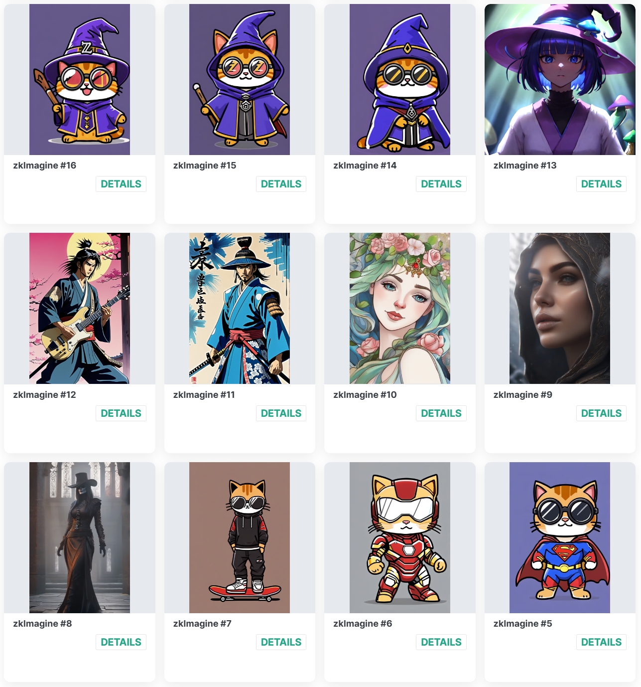 zkImaginearrow-up-right is a NFT collection on ZKsync Era mainnet. You can mint your AI image into zkImagine NFT to permanently store it in your digital wallet. The supply is unlimited. Creators can launch sub-collections from the zkImagine collection, and turn your creativity into your customized NFT collection.